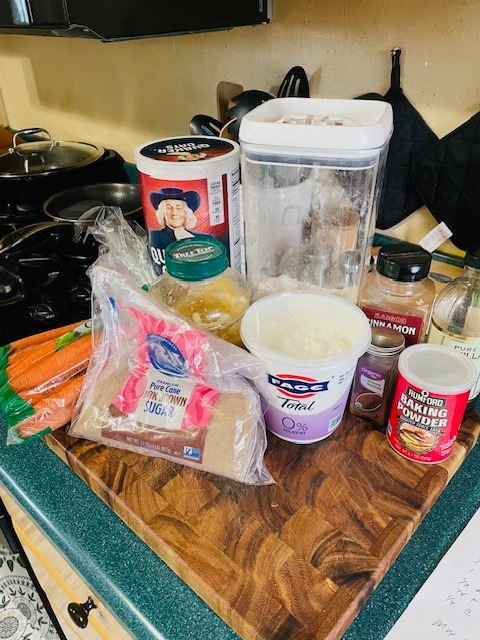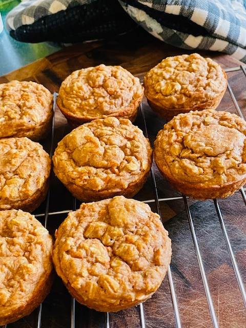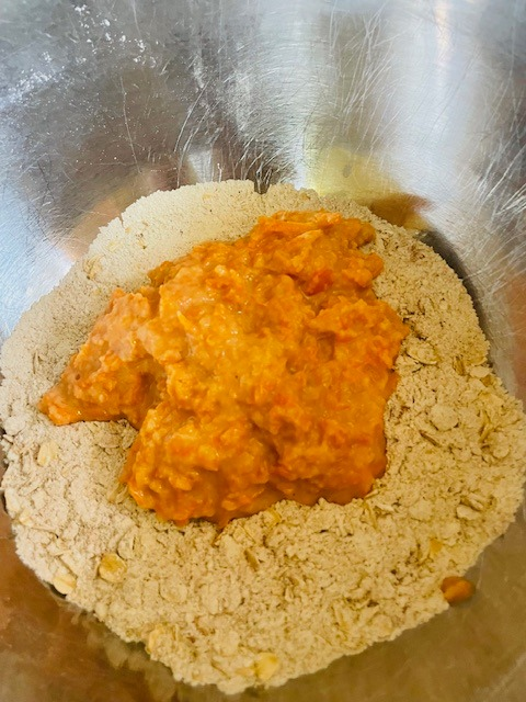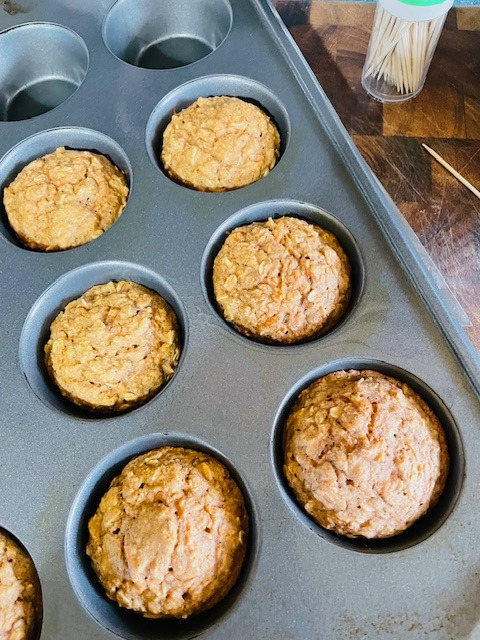 Mix wet ingredients in a medium bowl including carrots. Mix dry in a larger bowl. Mix wet into dry. Using a ¼ cup scooper for each muffin.