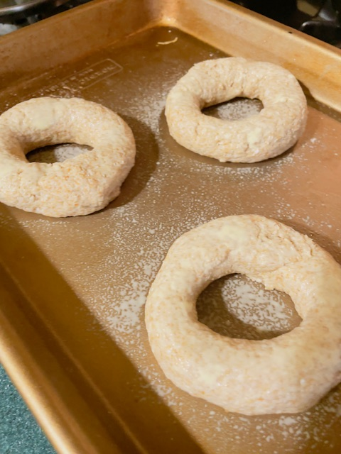 Mix cottage cheese, sweetener and honey together in a medium bowl. Add flour and powder. Using a large wooden spoon, mix, mashing curds into flour, keep mixing and mashing until a dough has formed. Remove from bowl and divide into 3 equal portions (77-79 grams each) Roll into a 9-10” log, connect the ends, sealing seam on top and bottom.