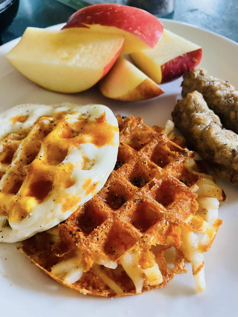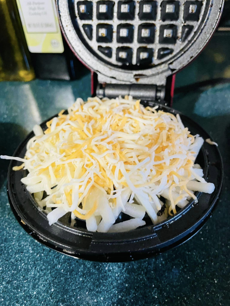 Heat 4” waffle iron, grease then add 30 grams of hashbrowns, top with 20 grams of cheese, press down firmly and hold it it a few seconds then just let it cook, probably 3-5 minutes. Check on it , if sticks to the top it's not done, close and let cook until it no longer sticks.