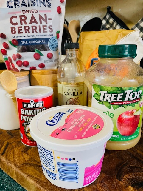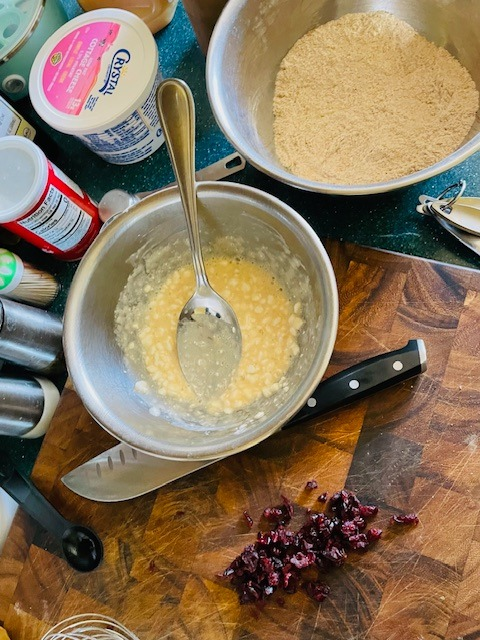Add dry ingredients except cranberries to a medium bowl, mix. Whisk together in a separate bowl: wet ingredients. Pour wet into dry, quick mix, add cranberries. Continue to mix until dough forms.