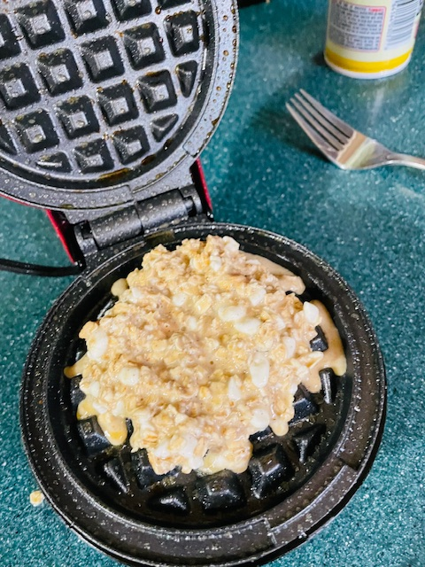 Spray iron with cooking spray, add 1/3 of the batter to the center, close lid. Cook 3-3 1/2 minutes. You can lift the lid in 3 minutes, if you want to cook longer, go for it.
