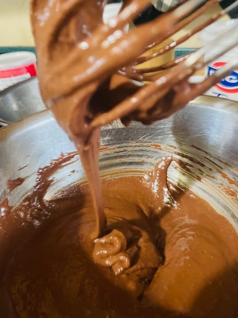 Mix flour, salt, powder and cocoa in a large bowl. In a medium bowl whisk remaining ingredients except chocolate. Add egg mixture to flour mixture. Whisk until smooth.