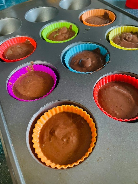 Place 8 silicone cup cake molds, in a cupcake tin, grease, and fill about 2/3rds each with batter.