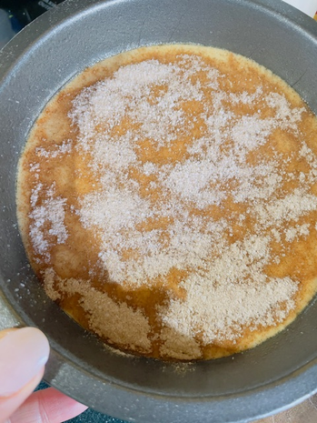 In a medium bowl, mix butter with brown sweetener and 3 tsp of white sweetener. Whisk in egg and vanilla. Sprinkle flour over top. In a small dish, mix: cream of tartar, salt, powder ¾ tsp of cinnamon. Add to flour, mix, whisk in applesauce, continue to whisk until smooth. Transfer to baking pan. In the small dish mix 2 tsps of white sweetener with ½ tsp of cinnamon, sprinkle over top of batter.