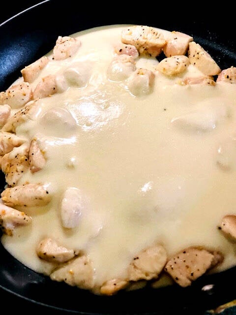 3 cups of cubed Cooked Chicken, I used Tyson’s Frozen Chicken Breasts, defrosted.