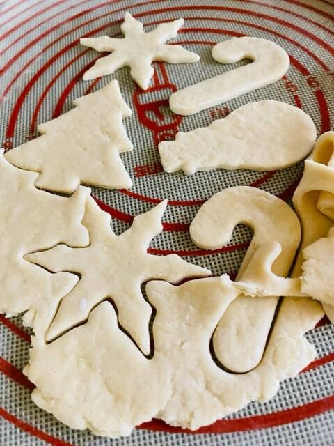 On a flat surface like a baking mat, I didn't need to flour it but you might need to if using a cutting board or counter top. Roll to 1/8" thickness and cut as many cookies as you can, place on lined baking sheet reroll dough and repeat until you've used all your dough.