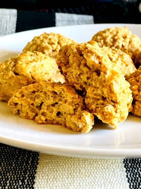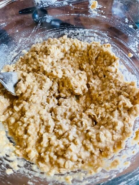 In a medium bowl, add oatmeal, applesauce, egg, pancake mix, stir to combine. Use a 1 1/2” cookie scoop, place on baking sheet, they don’t spread much so need to place them 2” apart.