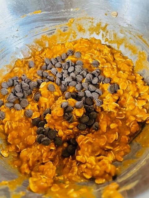 In a medium bowl, mash banana, add pumpkin, peanut butter, syrup, cinnamon, mix. Add oats, sprinkle baking soda, mix until combined, fold in chips.