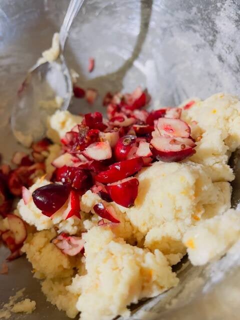 Mix in yogurt and butter. Sprinkle in flour and combine with spoon, mix in cranberries.