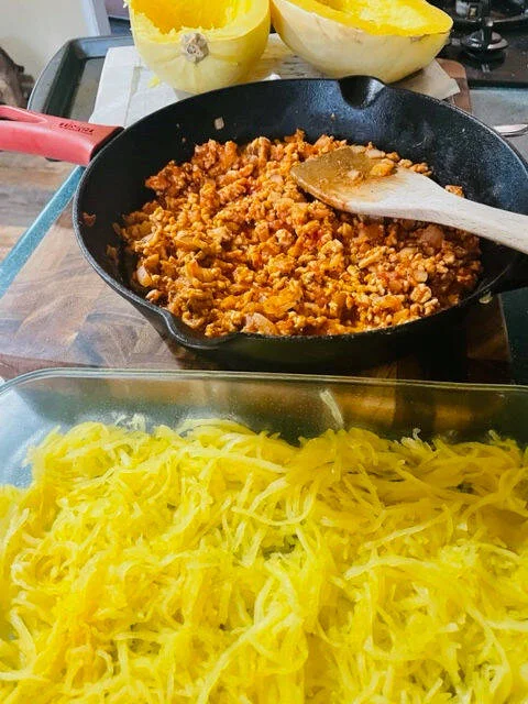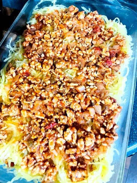 Remove squash from oven (after 45 minutes) leave oven on, loosen/scrape insides with fork, using insides from one ½ spread into a 9x13 greased casserole dish, layer ½ meat mixture, top with other ½ of squash then rest of the meat, top with cheese.