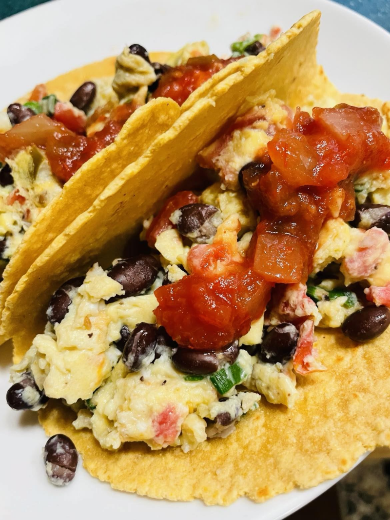 Whisk eggs, stir in Rotel, black beans and green onions pour into a 12" nonstick skillet. I spray it with I Can’t Believe It’s Not Butter. Scramble until cooked.