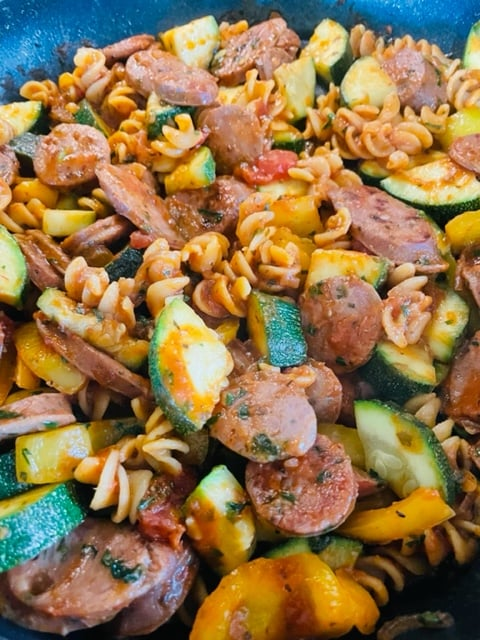 In a 12" skillet, heat your olive oil, add your sausage and cook until browned, add your veggies, seasoning, parsley. Add your pasta to the boiling water, cook al dente, about 7 minutes meanwhile cooking your veggies/sausage. Drain pasta and add to your skillet. Add your sauce, mix, cover, 15 minutes or until zucchini is soft.