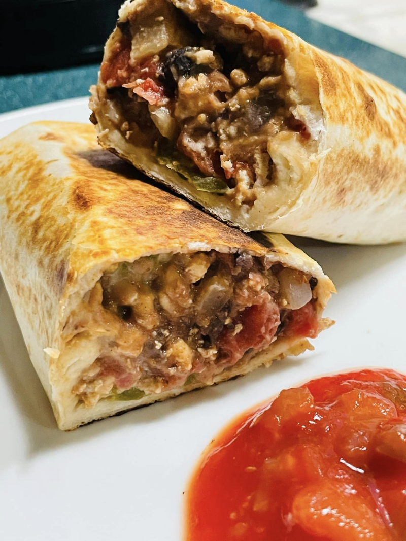 Add filling to chosen tortilla add cheese, jalapeños, sour cream etc.. wrap into a burrito, heat a clean skillet, PAM spray, place burrito seam side down until crispy, turning to crisp all sides.
