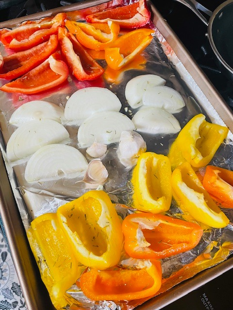 Lay prepped peppers, onion, and garlic on a large baking sheet. Drizzle with olive oil and sprinkle with rosemary.